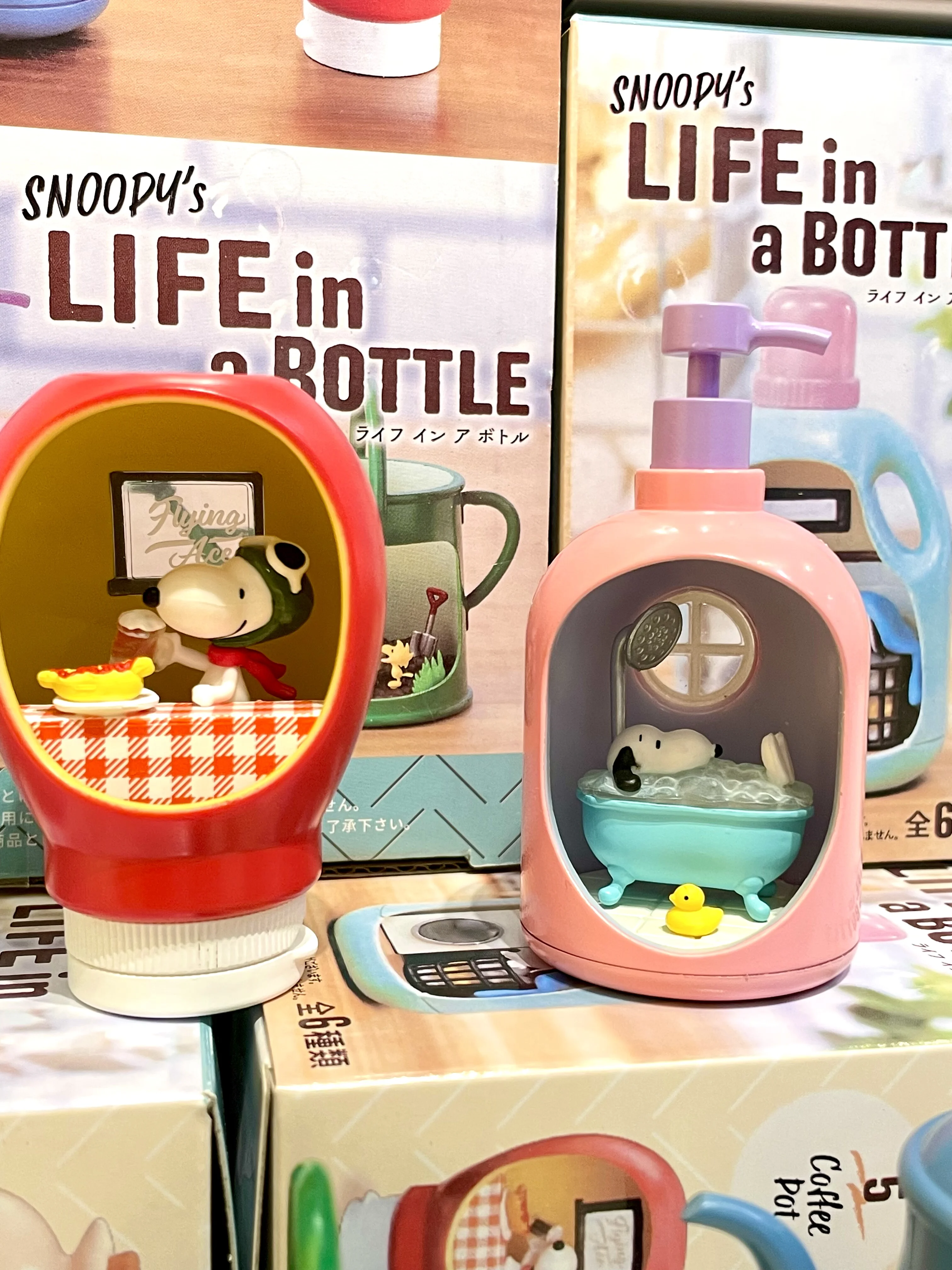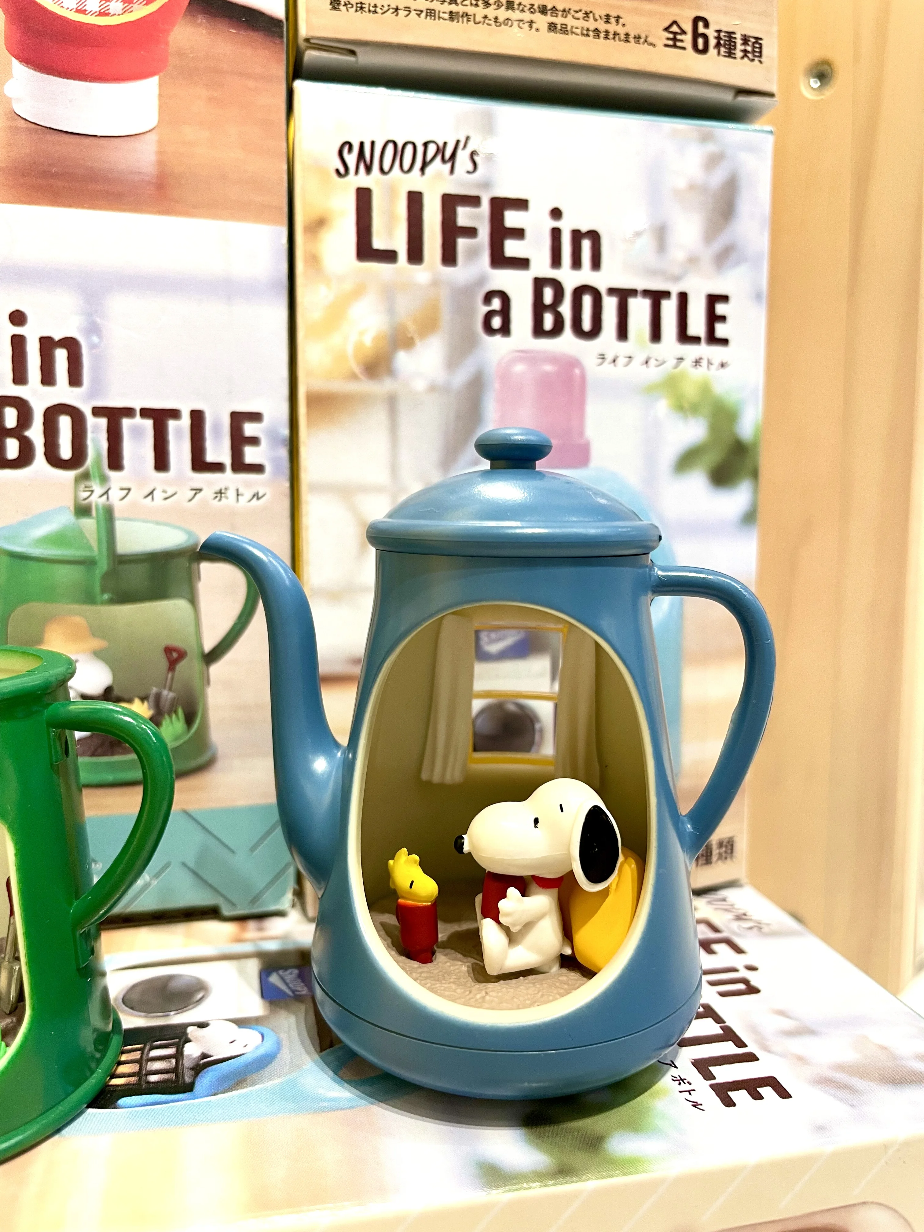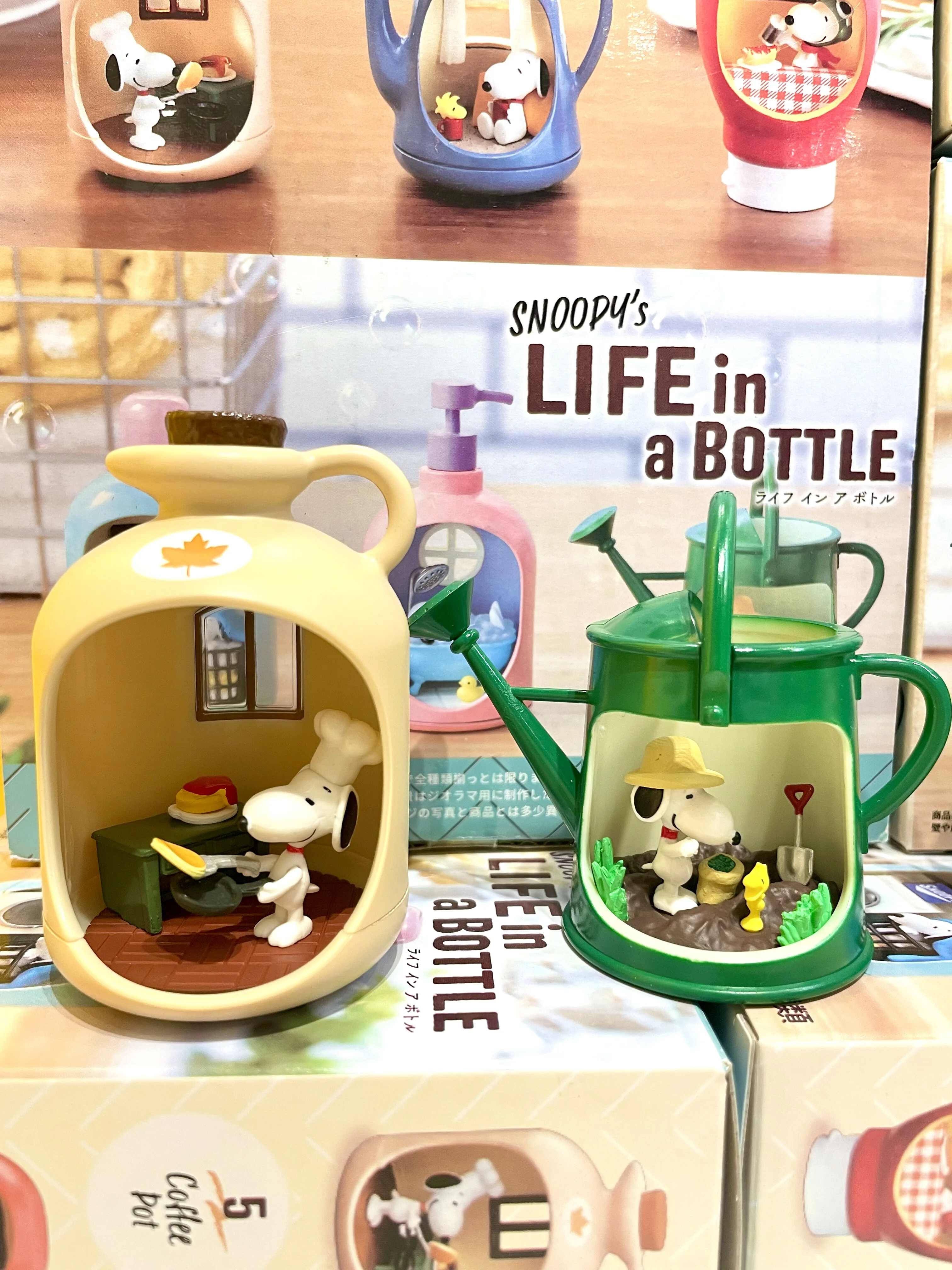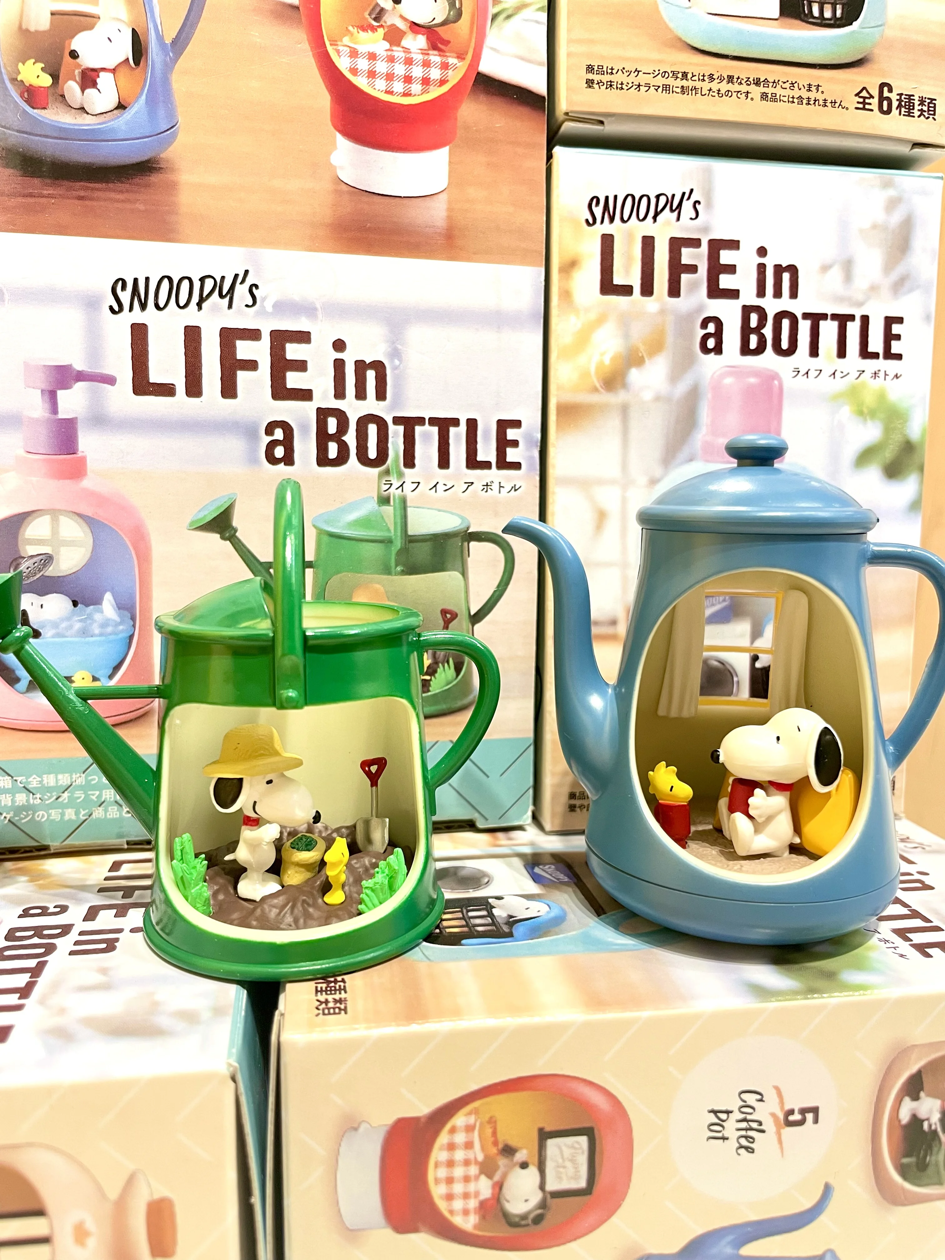 This amazing 'Life in a Bottle' miniatures series from Re-Ment Japan features Snoopys and Woodstock in adorable scenes encased in mini bottles. The terrariums come in parts so you have to assemble them yourself but they're super easy and fun to put together! Everything in the series is Snoopy themed and the terrariums themselves are shaped like various household bottles!